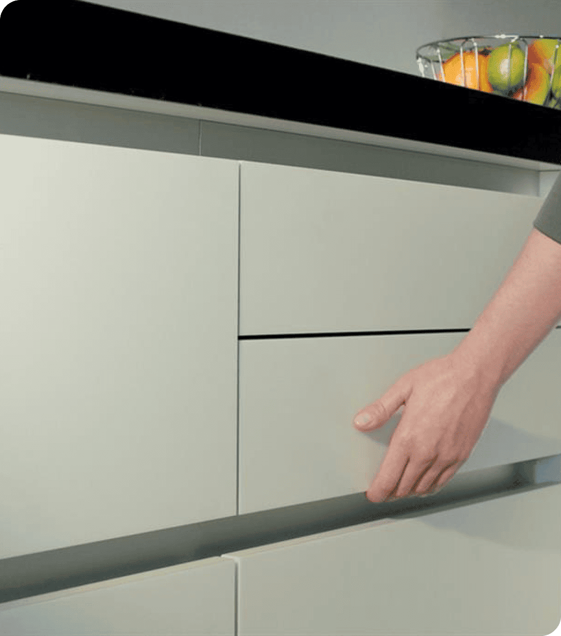 Ҳоло дар ошхонаҳои мо дастгоҳҳои муосири Gola истифода мешаванд, ки онҳо ҳалли инноватсионӣ буда, услуб ва функсионалиятро муттаҳид месозанд. Ин низоми пинҳонии профилҳо ба рӯи дарҳо насб шудааст ва имкони кушодани ҷевонҳо ва ҷарҳои ошхонаро бе дастакҳои намоён фароҳам меорад. Дар натиҷа шумо сатҳи ҳамвор ва минималистиро мегиред, ки тарҳи муосир ва зебои ошхонаи шуморо таъкид мекунад.
